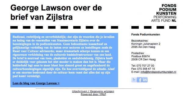 In een blog reageert de voorzitter raad bestuur van het Fonds Podiumkunsten, George Lawson op de plannen van staatssecretaris Halbe Zijlstra.